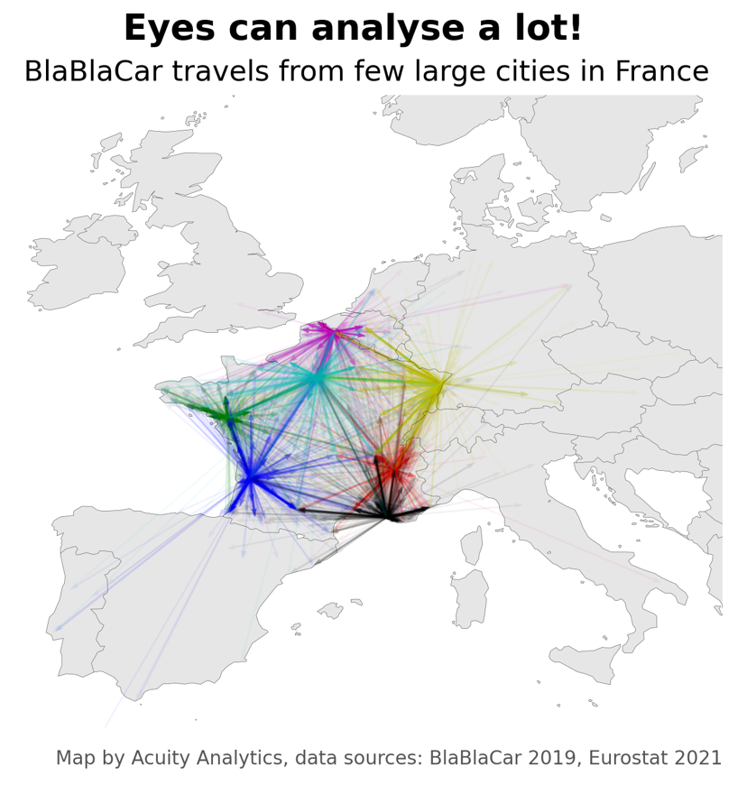 Data visualisation can be a powerful approach to analyse and discover new insights from its data simply by looking at it. We used data from BlaBlaCar obtained through their API in order to illustrate how data visualisation can drastically change the way to discover a dataset.