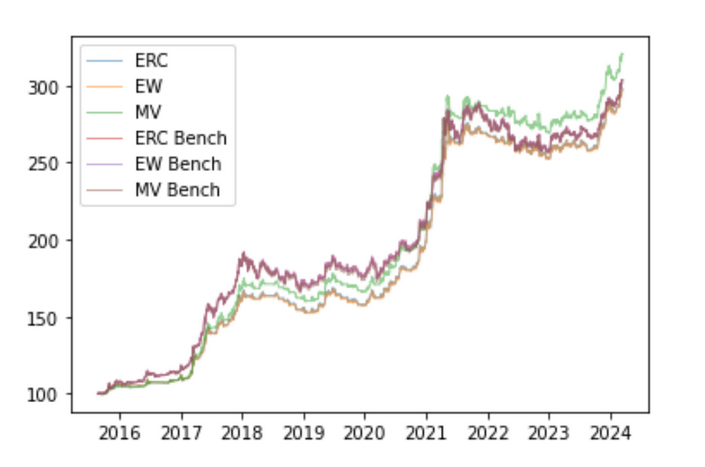We implemented a simple momentum strategy. Momentum strategies are classic and applied in different asset classes. The strategy is simulated between February 2015 and March 2024 on a universe of 8 main cryptocurrencies with an rate of 10% (including BTC and ETH). Different values for the momentum interval were tested, 15 days gives the best results. To be robust to the date of initialization of the performance calculation, we calculate 15 signals in shifting the calculation origin by one day. Each portfolio is rebalanced every 15 days, the cryptos are equally weighted. By curiosity, we build benchmarks containing all crypto on the same model equally weighted in order to evaluate the interest of this simple strategy. Then we aggregate these 15 series into an equally weighted portfolio or weighted by weights based on risks (MV, ERC). We construct aggregated benchmarks on the same model.
